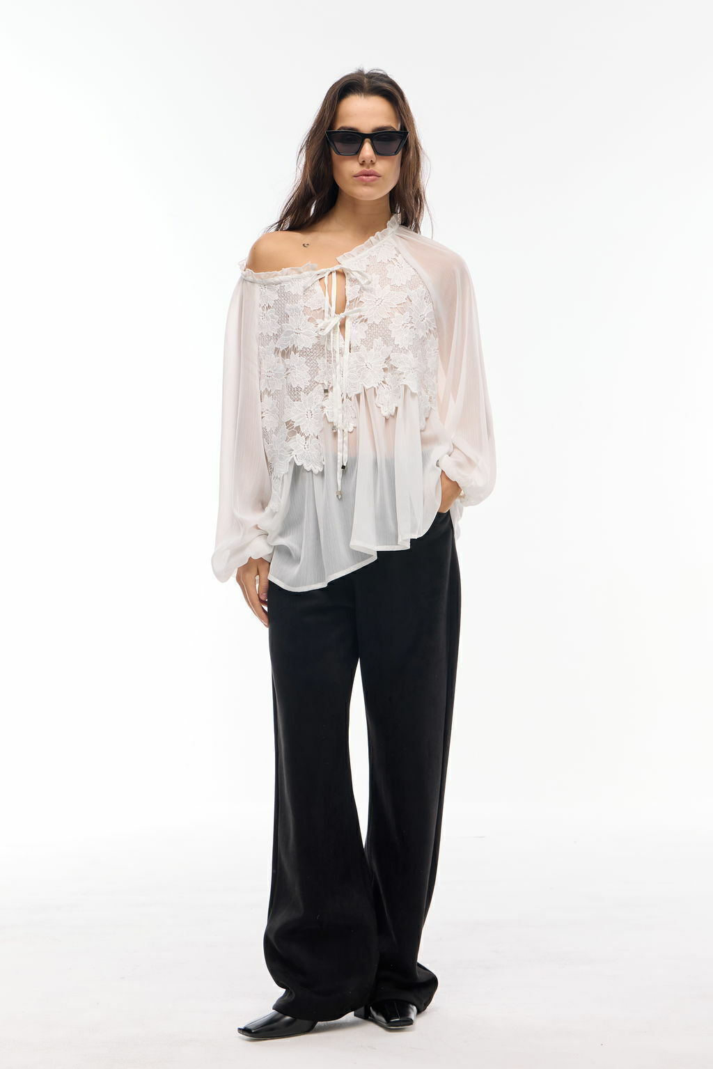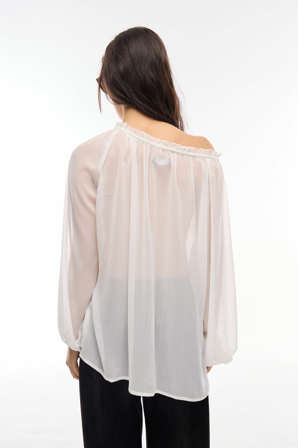 Blusa holgada con mangas largas abullonadas y puños elastizados. Lleva escote redondo con abertura en V y un pequeño volado por todo su cuello. También dos lazos para atar en la zona frontal (el lazo superior es ajustable). Tiene un recorte decorativo de gipiure en forma de canesú.