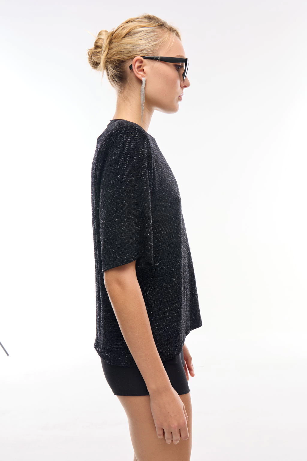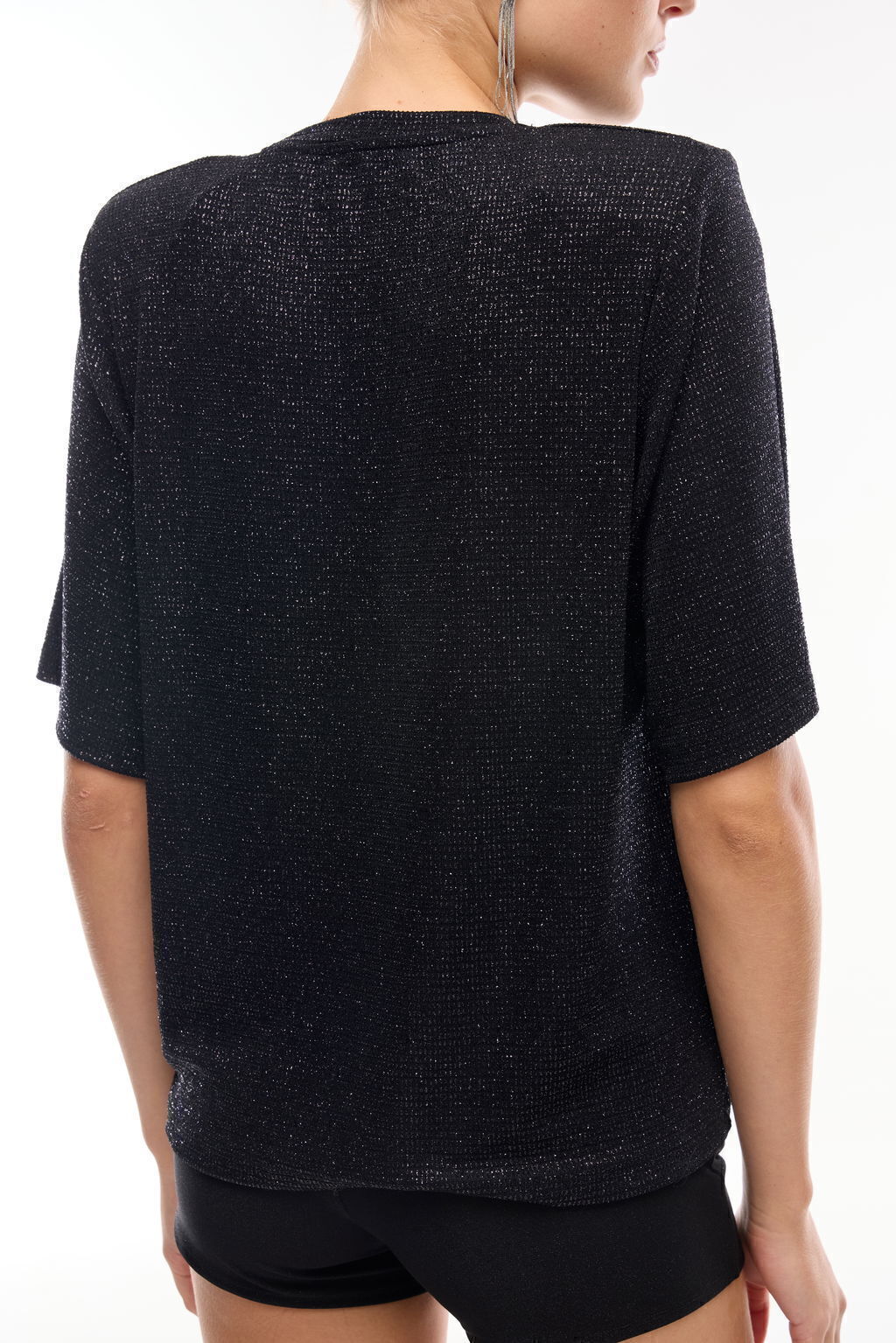 Remeron de corte recto, holgada con escote redondo. Sus mangas son cortas y lleva hombreras.