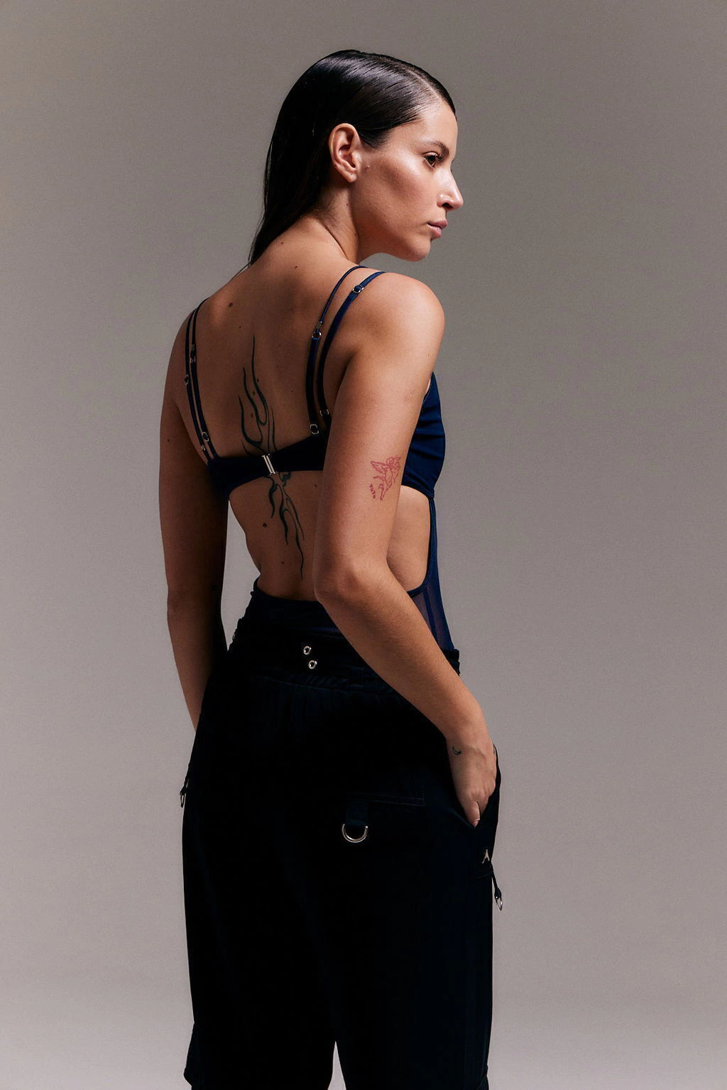 Body lencero de breteles finos regulables. Su corpiño es tipo triangulo , está forrado y lleva elástico por todo su contorno. Lleva un segundo bretel elástico decorativo que pasa por el centro del busto. El cuerpo tiene transparencias y varios recortes que dejan ver la piel. Se accede a la prenda mediante broches snap ubicados en la parte inferior y un gancho mariposa colocado en el centro de espalda