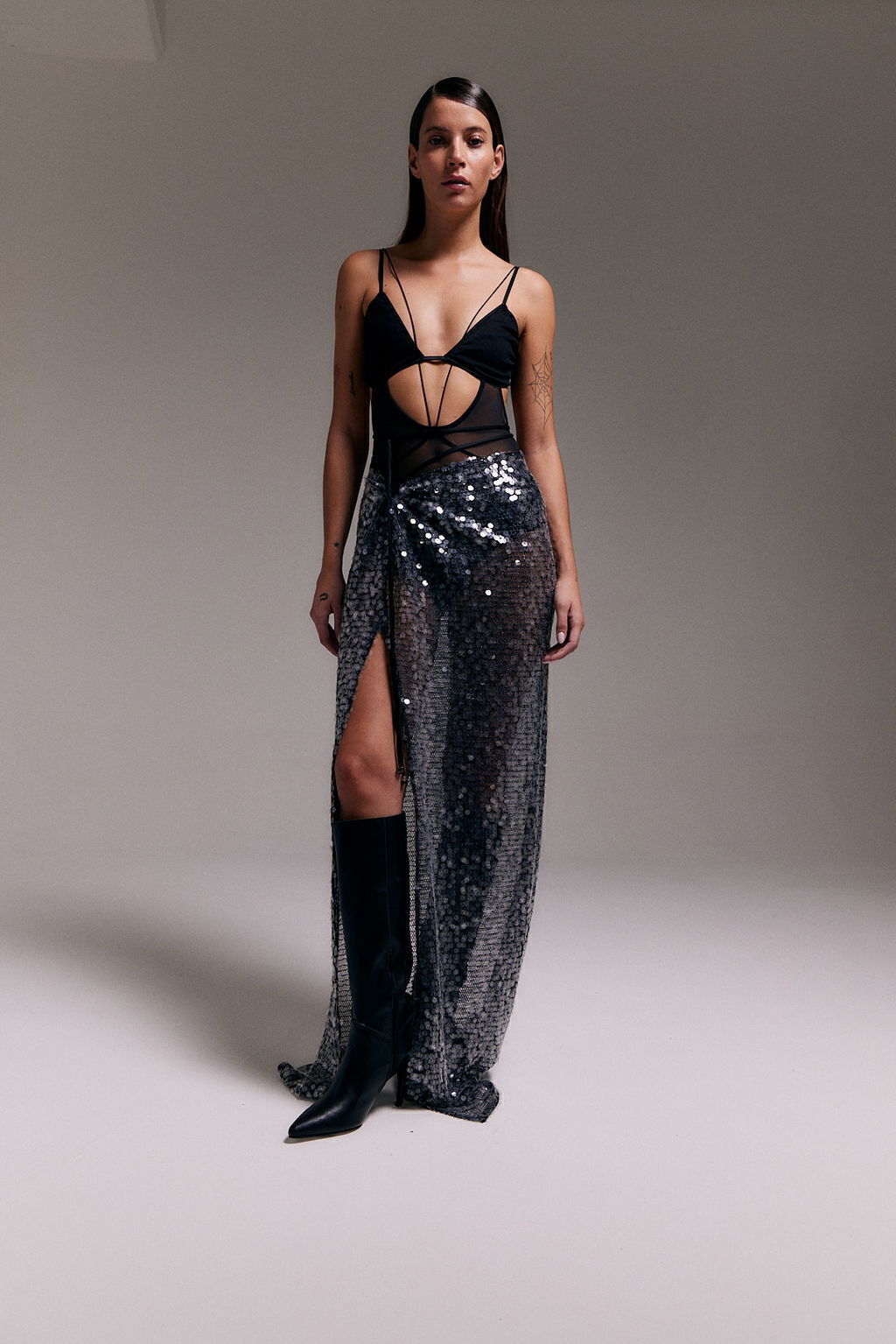 Body lencero de breteles finos regulables. Su corpiño es tipo triangulo está forrado y lleva elástico por todo su contorno. Lleva un segundo bretel elástico decorativo que pasa por el centro del busto. El cuerpo tiene transparencias y varios recortes que dejan ver la piel. Se accede a la prenda mediante broches snap ubicados en la parte inferior y un gancho mariposa colocado en el centro de espalda