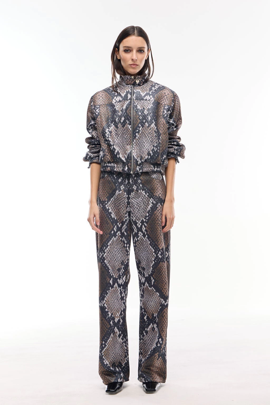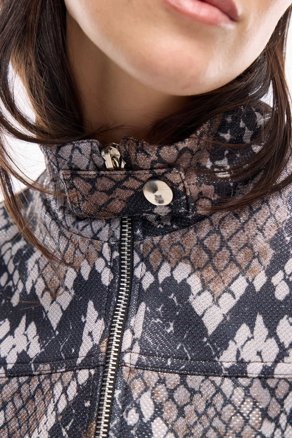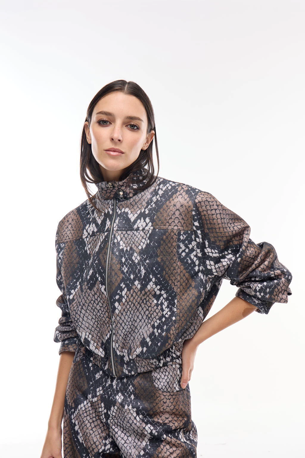 Chaqueta tipo bomber. Su cuello mao tiene una presilla abrochable. Lleva canesú y recortes verticales, pespunteados con estilo jeanero. Tiene dos bolsillos ojal en el frente y sus puños son abrochables. Está completamente forrada. Se accede a la prenda mediante un cierre desmontable en su centro delantero.