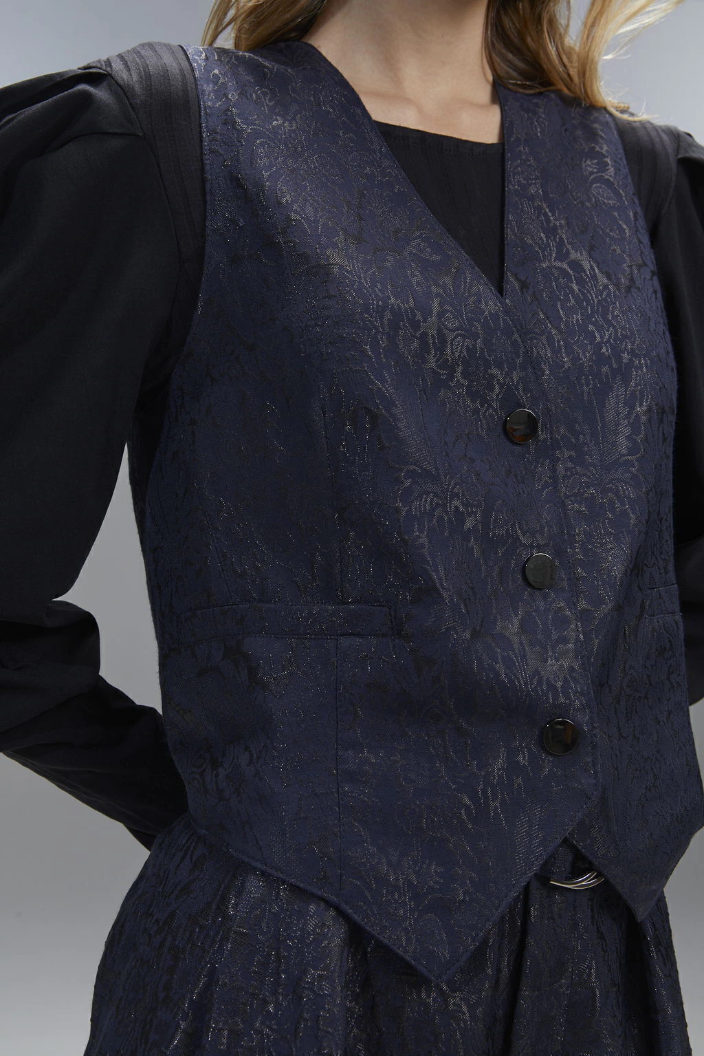 Chaleco de corte sastrero con escote en V. En el frente tiene pinzas de entalle, lleva cruce simple y se prende mediante broches metálicos.
