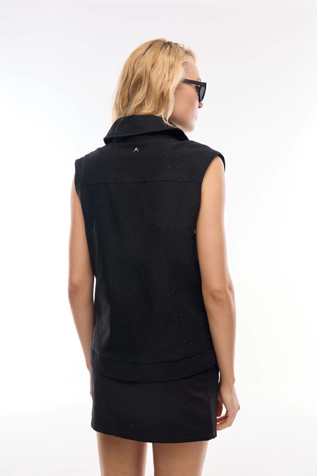 Chaleco con corte over y cuello solapado. Está totalmente forrado y tiene recortes con pespuntes decorativos tipo jeaneros por toda la prenda. En su frente lleva bolsillos y se accede a la prenda mediante un cierre metálico frontal.