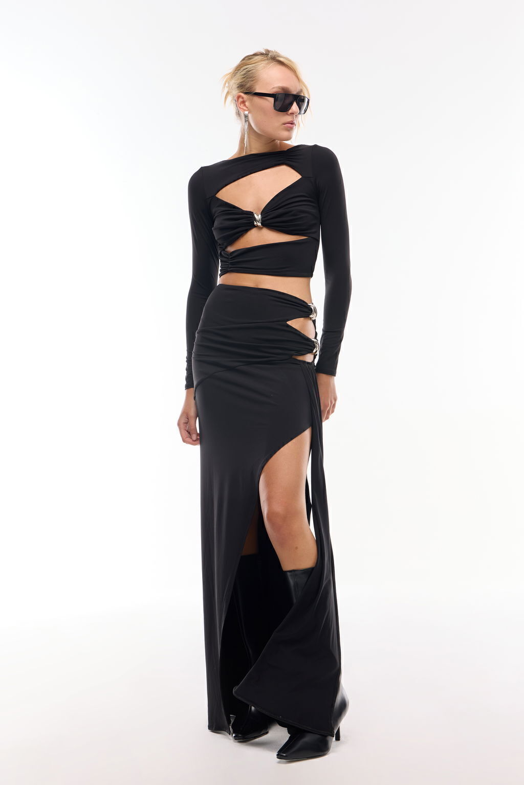 Falda larga con tajo en su lateral y un lazo que cae a lo largo hasta el ruedo. Lleva dos avíos metalicos decorativos y substracciones que dejan ver la piel, sobre su lateral izquierdo.