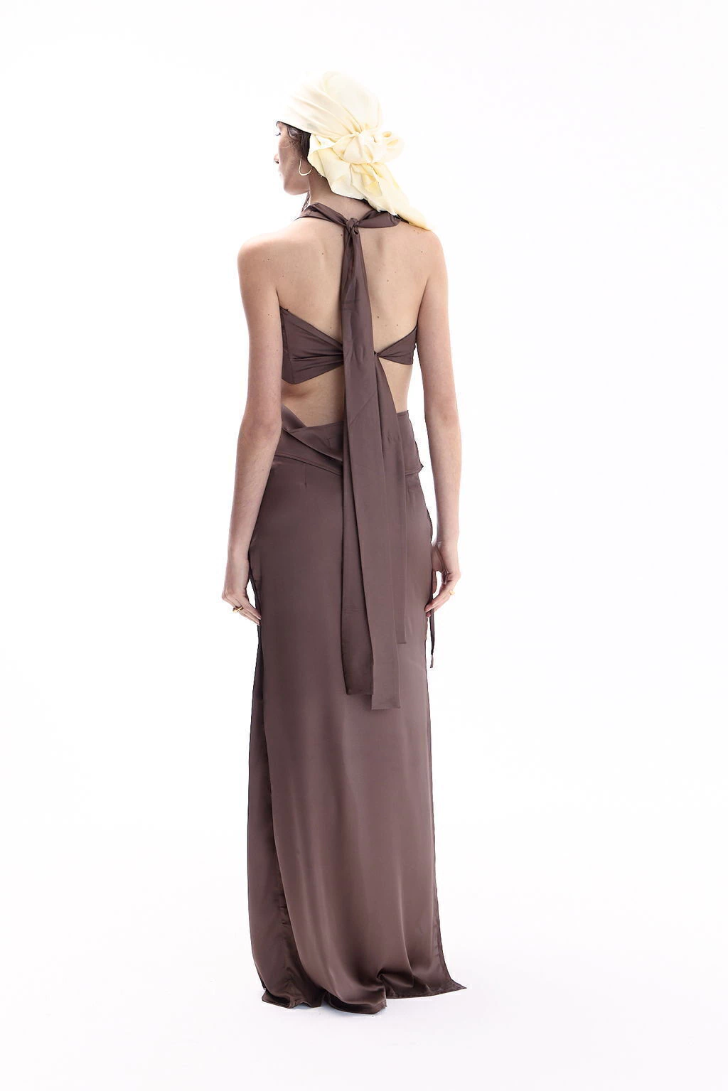 Falda larga con juego de transparencias. Lleva dos breteles finos anudables en el lateral de la cadera. Genera un efecto de capas asimétricas. Corte recto con tajo en el lateral. Se accede mediante cierre invisible en el lateral opuesto