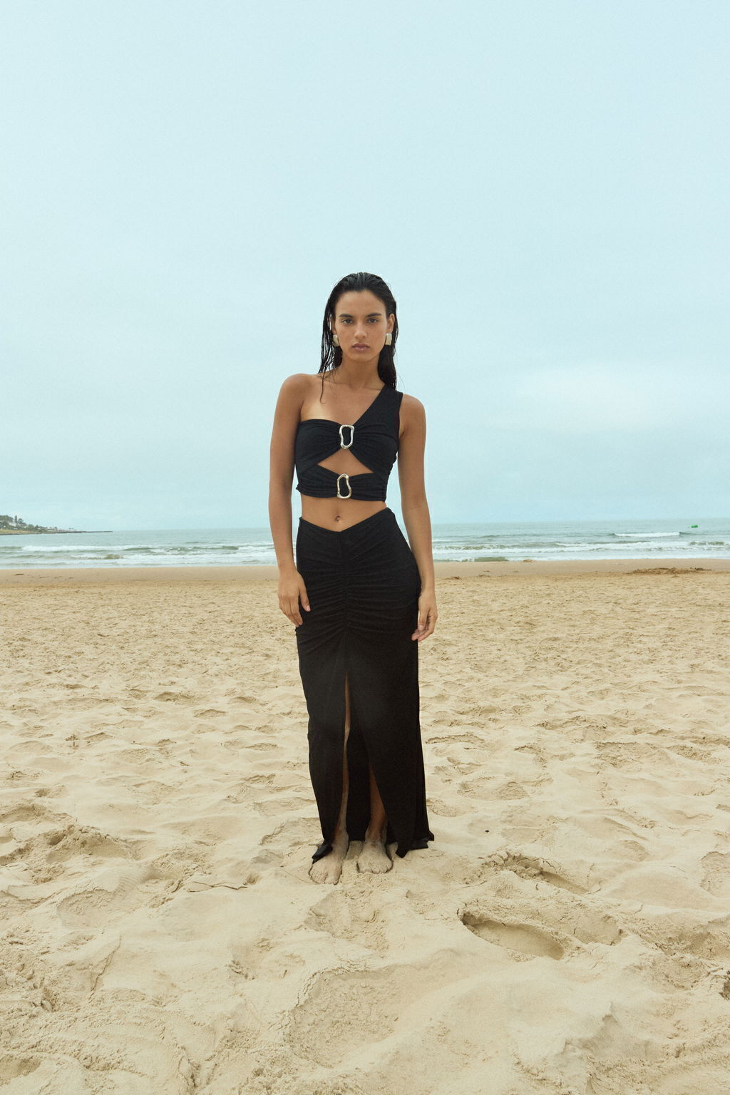 Se ajusta a la talla real. Su base elastizada está diseñada para un calce ceñido. El largo total de la prenda en plano es de 110cm para el Talle S; por talle aumenta 1,5cm el largo de la prenda. La modelo lleva un talle S.