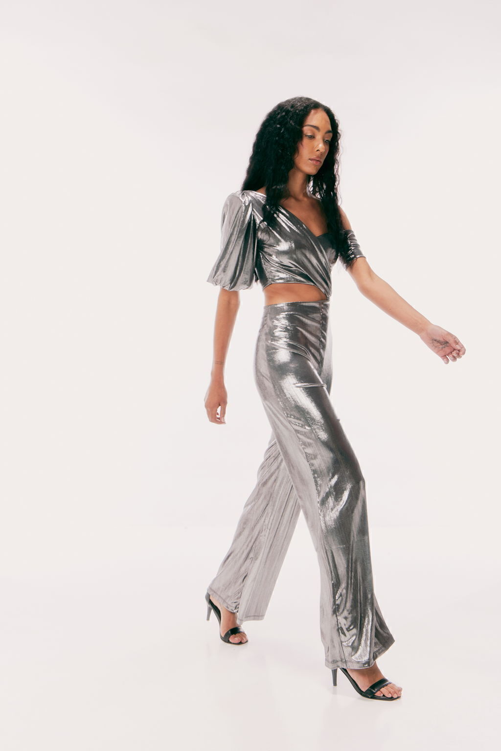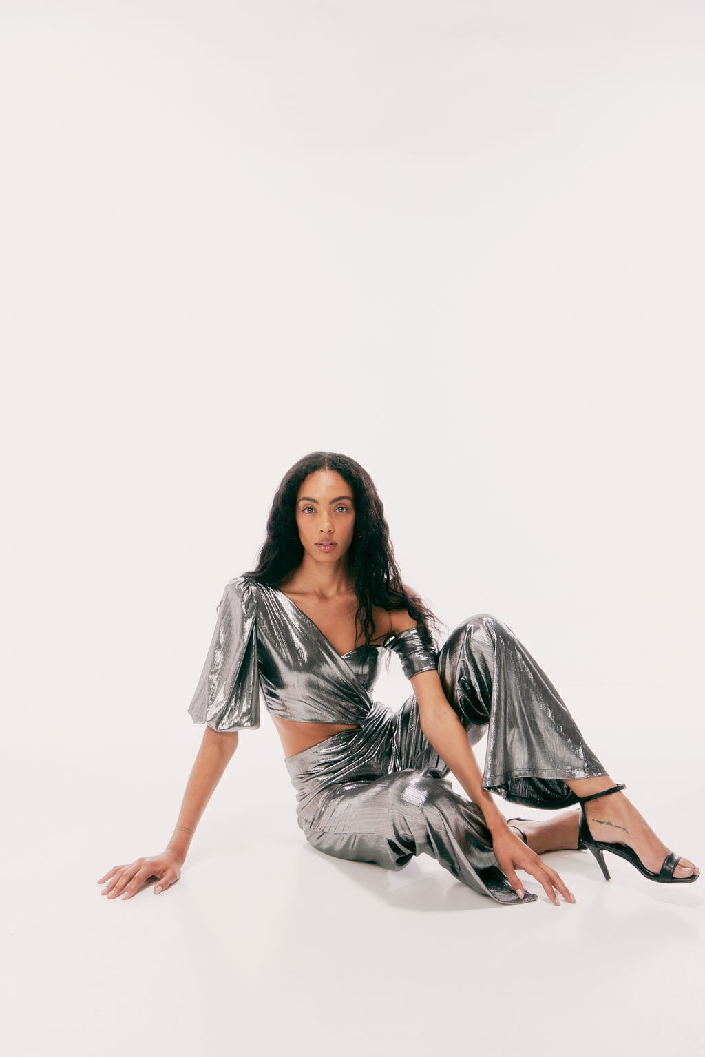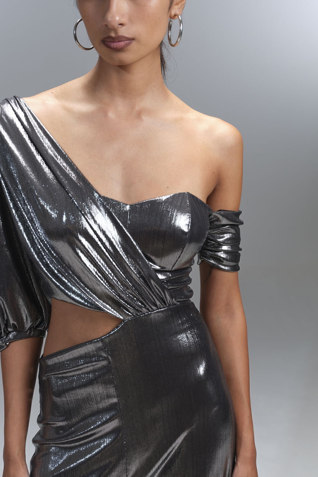 Mono largo con escote asimétrico y cut-outs. De escote asimétrico lleva strapless con una manga corta con volúmenes y drapeados. Su pantalón es holgado y su línea de cintura baja en diagonal.