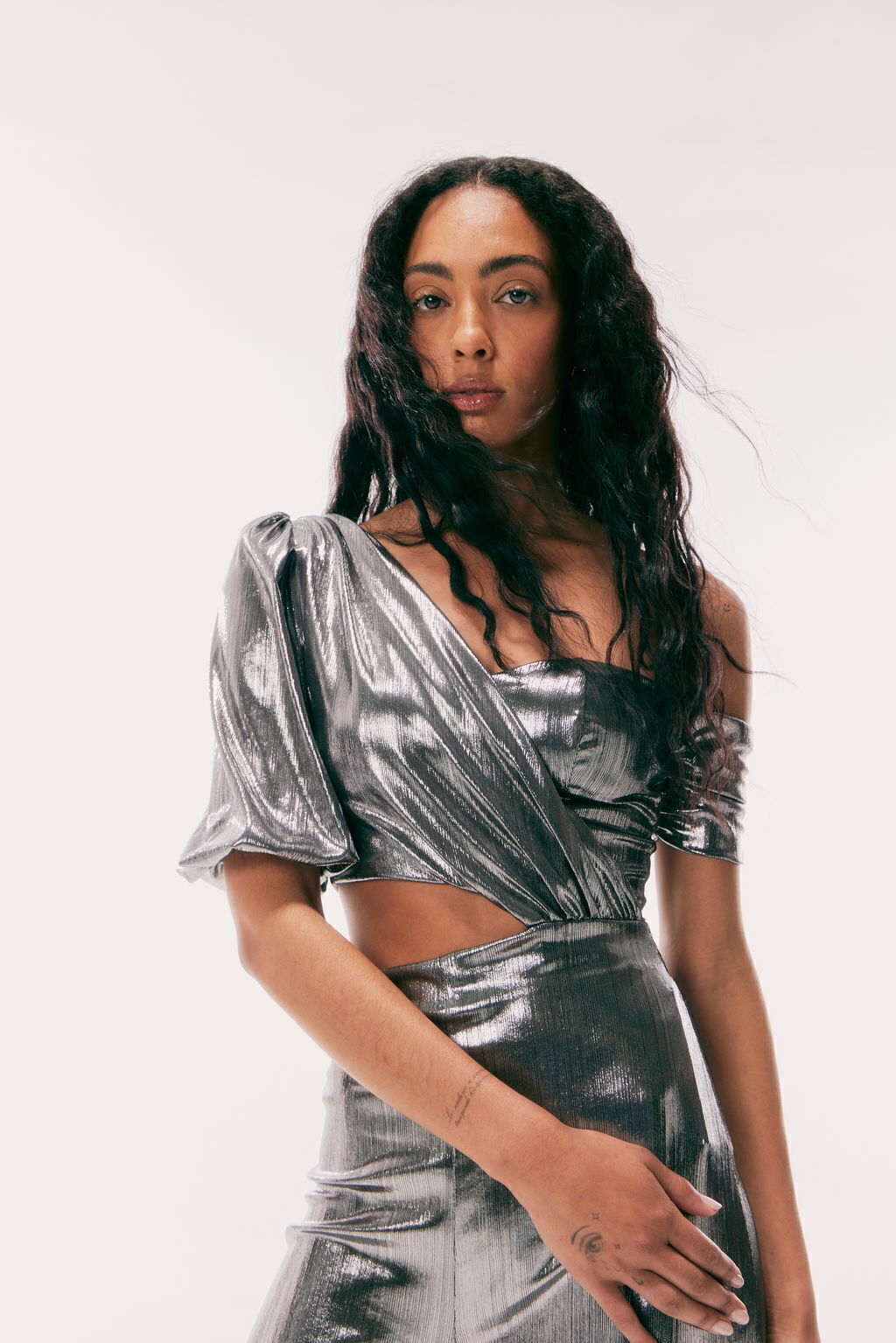 Se ajusta a la talla real, su corpiño realza el torso y permite mostrar piel con sus recortes. El largo total de la prenda en plano es de 154 cm para el Talle S; por talle aumenta 1 cm el largo de la prenda. La modelo lleva un talle S.