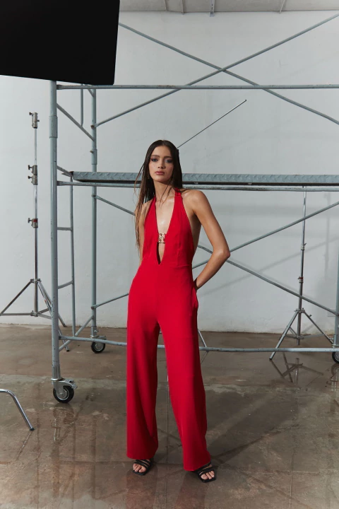 Mono largo, sin mangas con espalda descubierta. Lleva dos lazos que cruzan por detrás del cuello y se abotonan en los costados del top. Su corte es recto y holgado. Lleva bolsillos laterales invisibles. En el centro del pecho tiene un detalle metálico. Se accede mediante cierre invisible en el centro de espalda