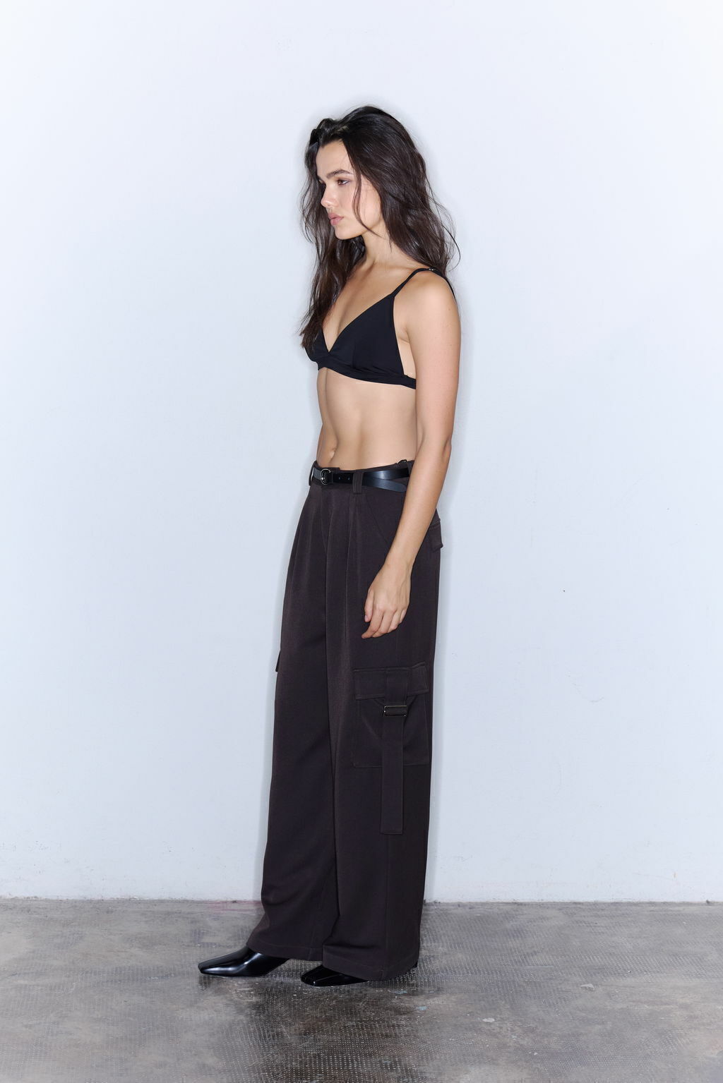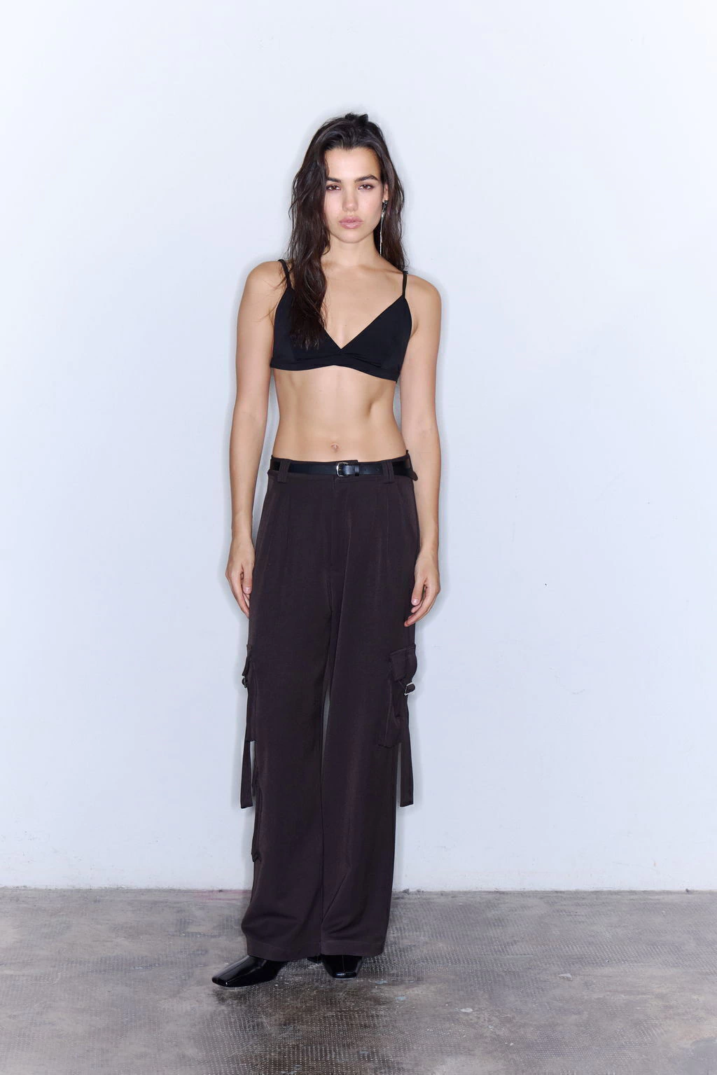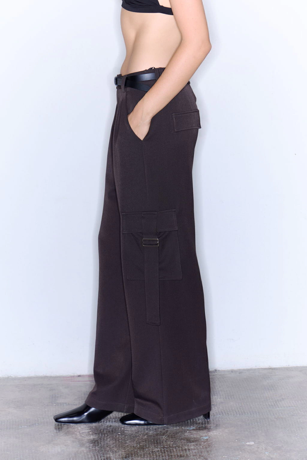 Pantalon amplio con corte recto y bolsillos tipo cargo aplicados en laterales. Lleva tablas en la zona frontal y pinzas en espalda. Además tiene dos falsos bolsillos con tapa por detrás.