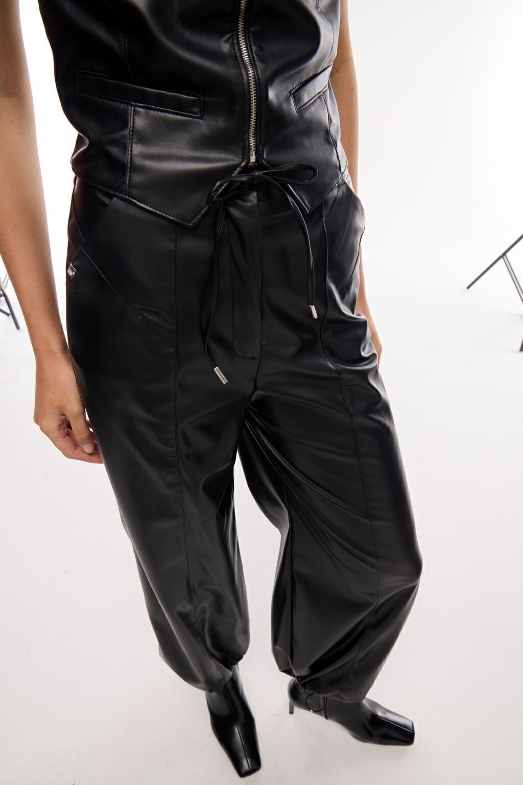 Pantalón tiro medio de calce holgado. Lleva recortes verticales en centro de pierna delantera y trasera. Su botamanga es ancha pero tiene un canal con elástico + tancas metalicas, que lo vuelven ajustable a gusto del usuario. Tiene bolsillos diagonales en los laterales y un lazo fino ajustable en su cintura.