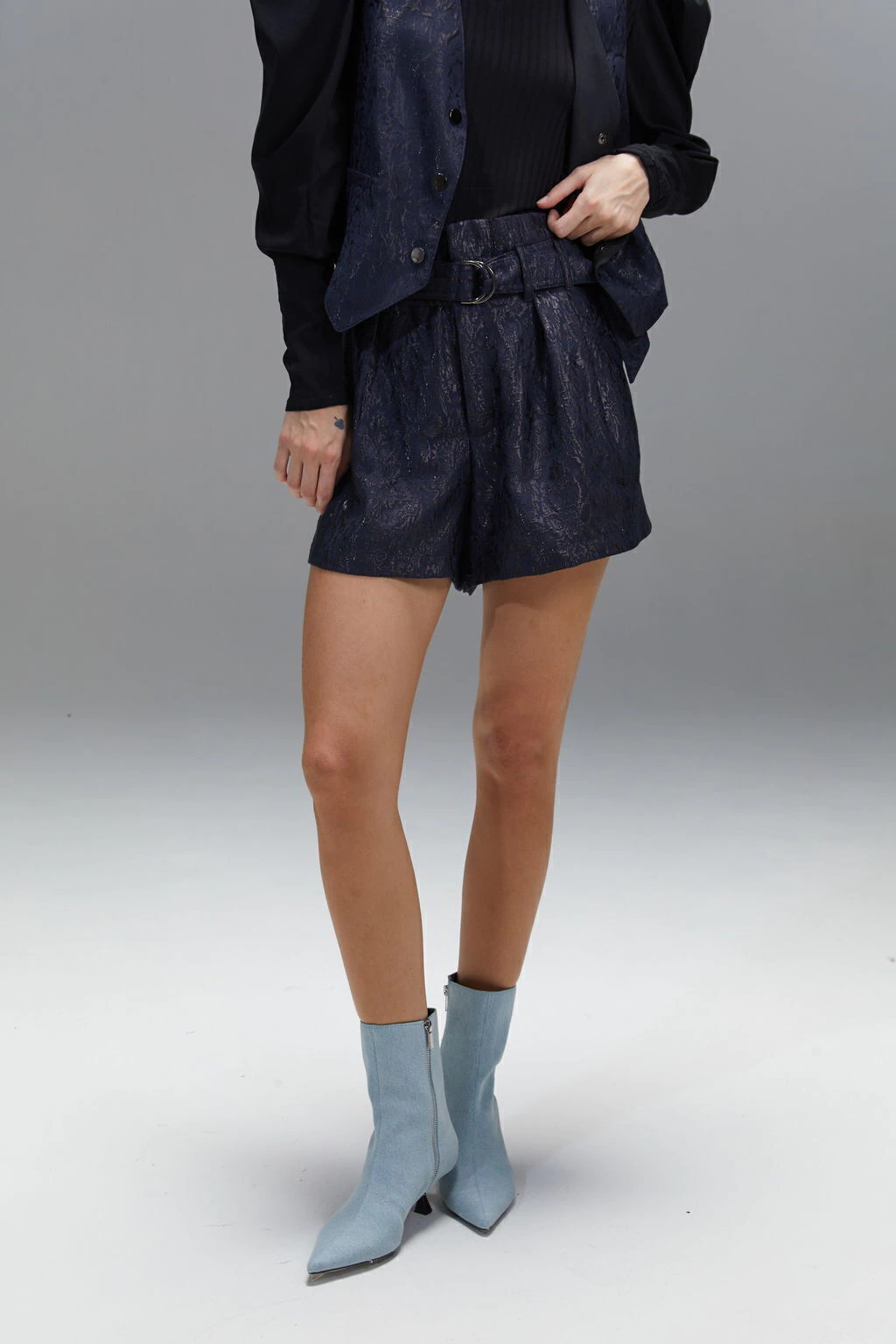 Short tiro alto, tipo sastre. En su frente lleva tablas y bolsillos laterales. Por detrás tiene falsos bolsillos ojal y pinzas de entalle. Su cintura es levemente elastizada y lleva de complemento un lazo ajustable con pasadores metálicos.