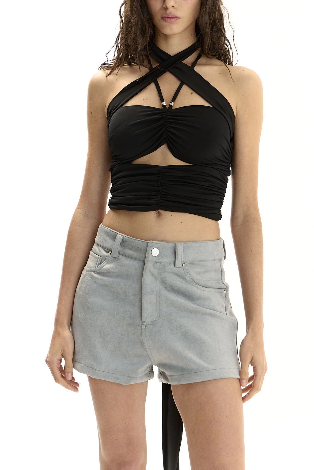 Short con calce recto. Por el frente tiene bolsillos jeaneros y en la espalda lleva canesú y bolsillos tipo plaqué. Se accede a la prenda mediante un cierre y un broche metálico por el frente. Tiene pasacintos.