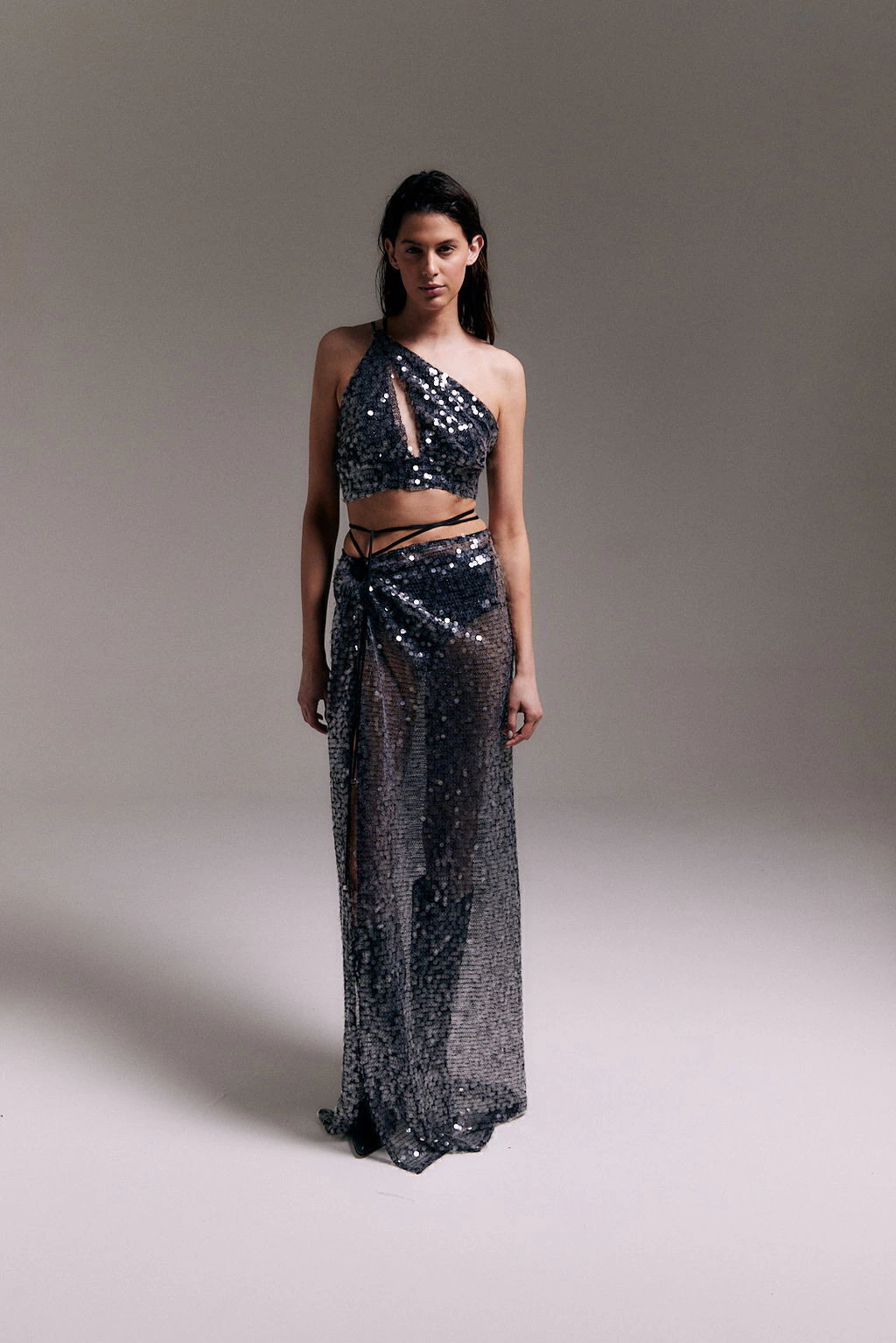 Top asimétrico de un solo hombro. Su calce es a la cintura y lleva una abertura diagonal en el centro del escote. En su espalda lleva un largo bretel que se acordona en ojalillos y se ajusta a medida del usuario. Está todo forrado