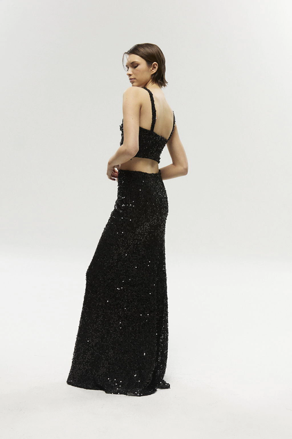 Top recto con tirantes cruzados y frunce en el centro de busto. Externamente lleva una tela tipo red con lentejuelas y transparencias. Por debajo está forrado con una tela opaca. Se accede a la prenda mediante un cierre invisible en el lateral. Tiene un cut-out en la zona central del abdomen que deja ver la piel.