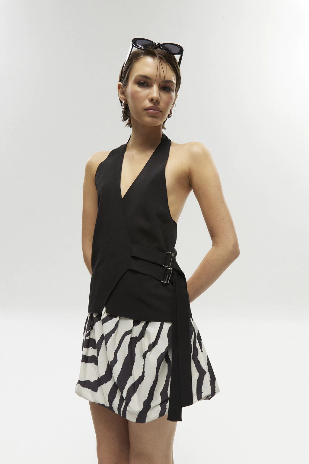 Top sastrero tipo chaleco con cruce delantero y espalda semidescubierta. Lleva cintos regulables con pasadores metálicos en el lateral de la cintura y detrás del cuello. Está completamente forrado. Se accede a la prenda mediante broches snap en el centro delantero.