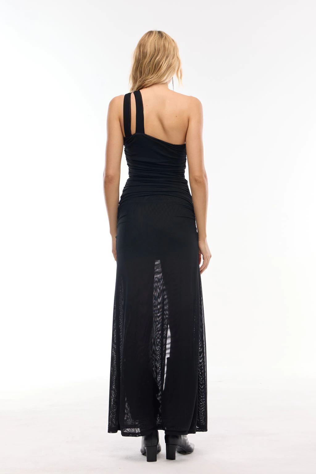 Vestido largo con escote recto. Lleva un bretel doble ancho en un solo hombro. Tiene dos aberturas en la zona del abdomen y un tajo sobre la pierna derecha que dejan ver la piel. A lo largo del vestido lleva varios avíos metalicos decorativos y se generan frunces en todo el cuerpo. Está completamente forrado.