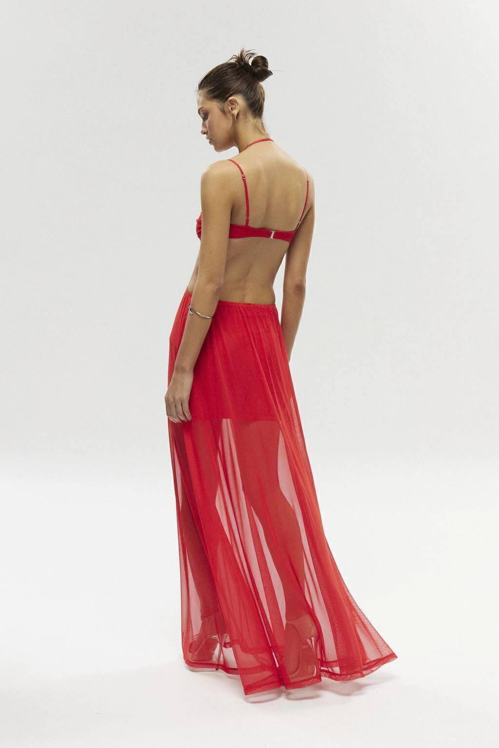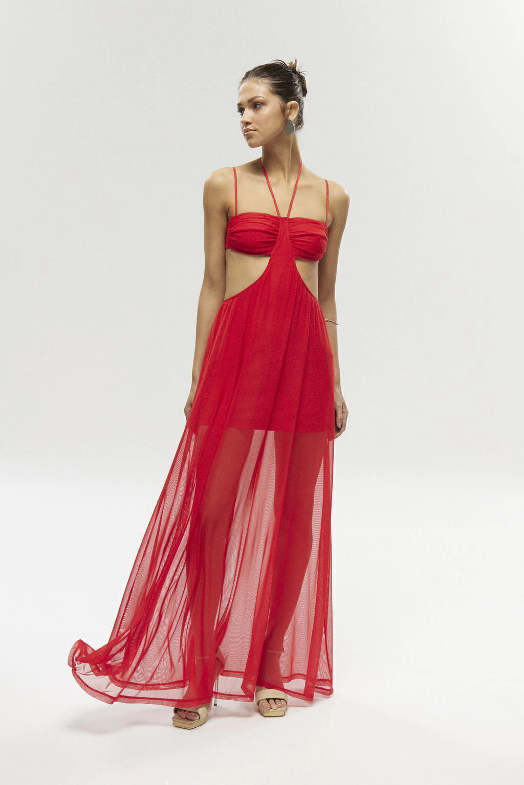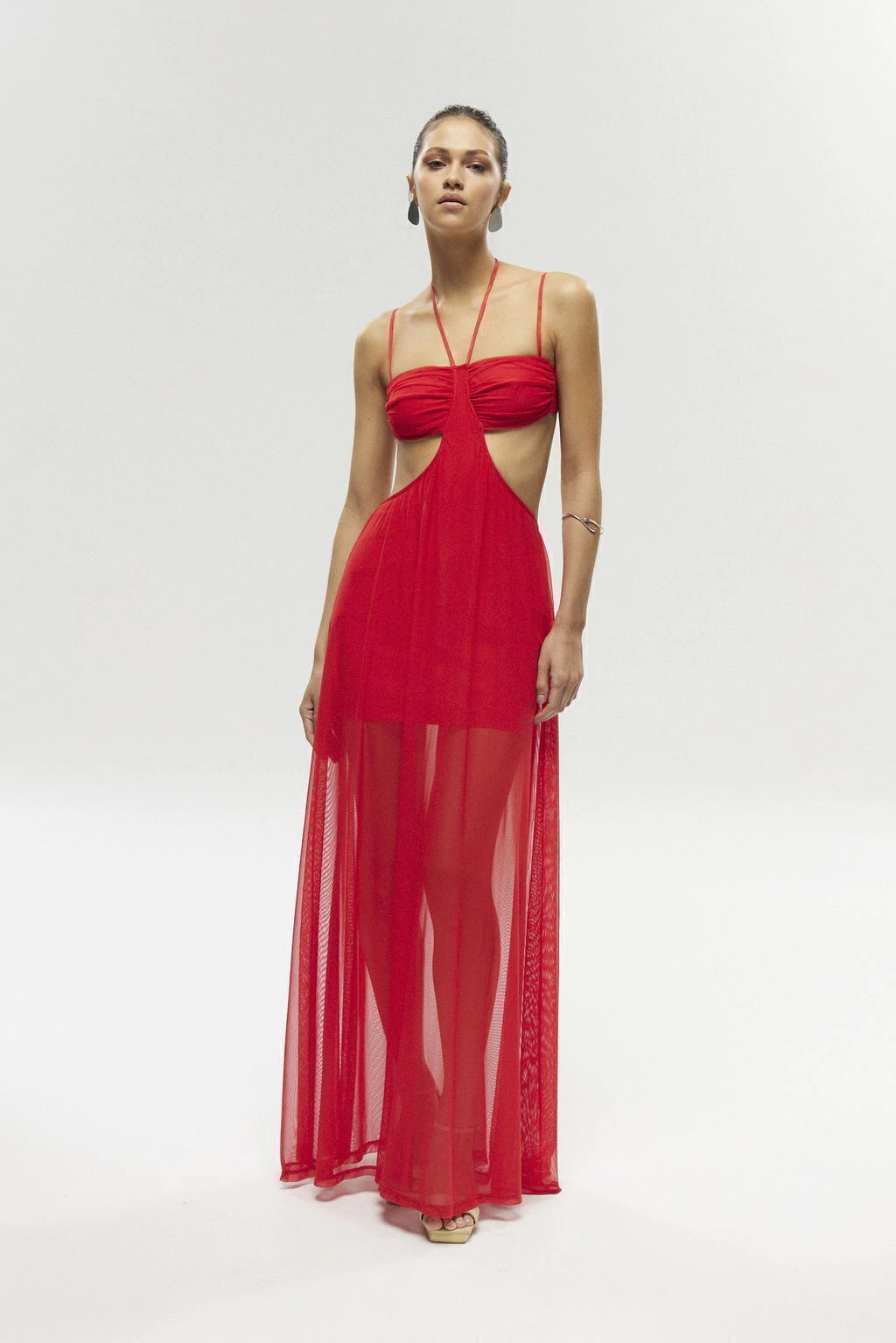 Vestido largo con breteles finos regulables. Tiene transparencias y frunces a lo largo de todo el cuerpo. Su falda es amplia y su top se ajusta al cuerpo. Se accede a la prenda mediante un gancho mariposa en la espalda del corpiño.