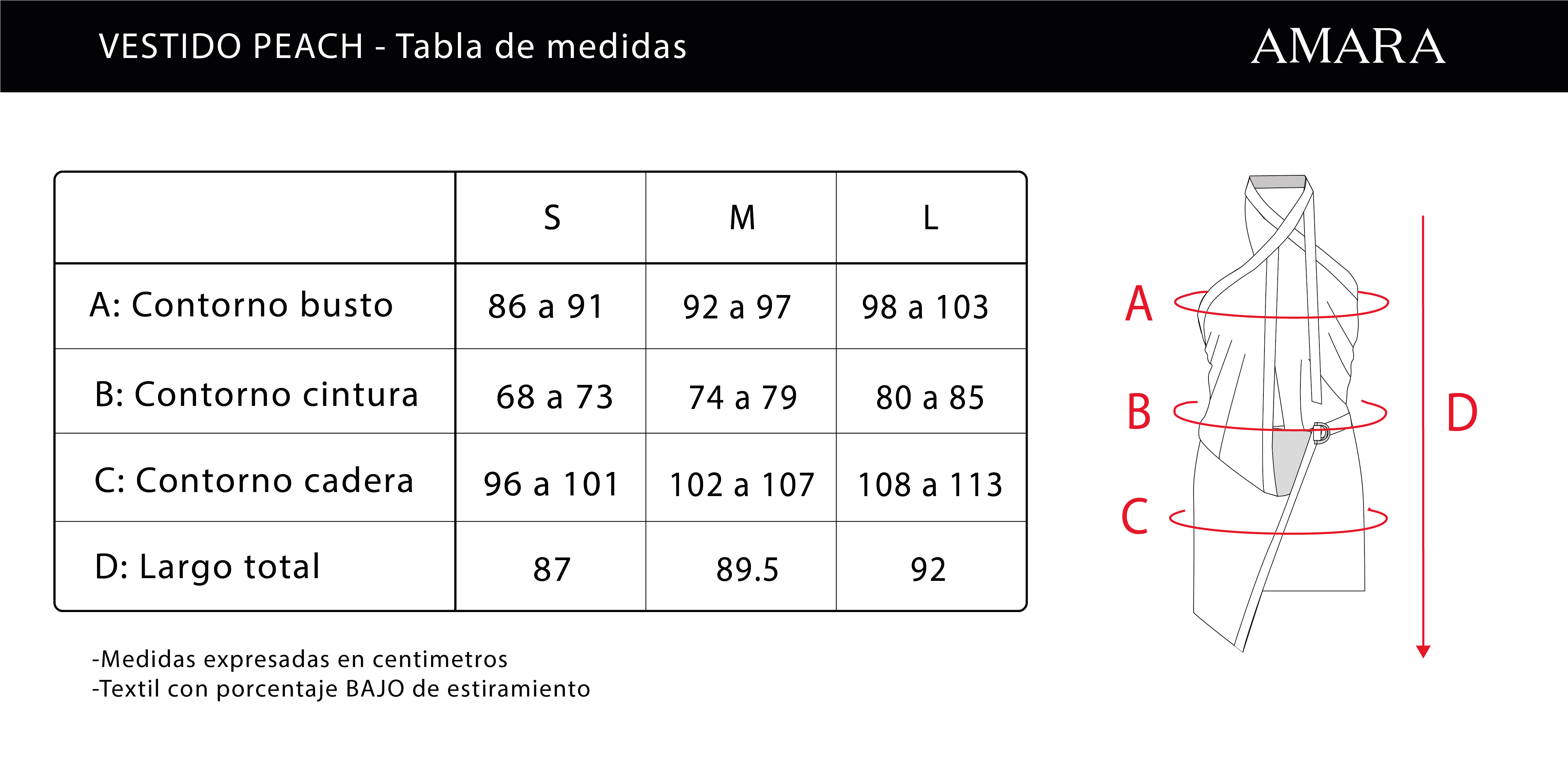 Vestido corto con escote halter abrochable detrás del cuello y falda tipo portafolio. En la zona de cintura lleva una tira que se pasa a través de dos medialunas metalicas y se ajusta.