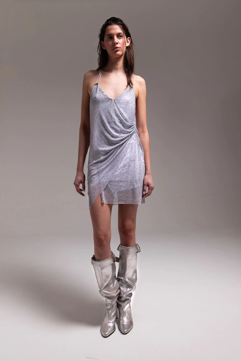 Vestido corto con cruce en el frente. Lleva breteles dobles de cadena que se enganchan detrás del cuello. Lleva un vestido opaco, al cuerpo, por debajo como forrería y otro vestido holgado con transparencias y strasses por encima.